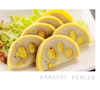 そこで藩の賄方であった平五郎が呼ばれ、蓮根を使った健康食を作るよう命じられました。平五郎は蓮根の穴に和辛子粉を混ぜた麦味噌を詰め、麦粉・空豆粉・卵の黄身の衣をつけて菜種油で揚げた「からし蓮根」を献上しました。 これを食べた忠利公はたいそう気に入って常食されるようになり、みるみるうちに剛健になられたそうです。